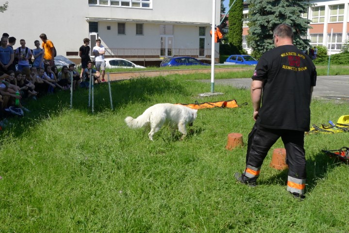 3. Ukážka záchranárskej kynológie – vyhľadávanie figuranta (zranenej osoby) + výklad o plemene psa a výcviku