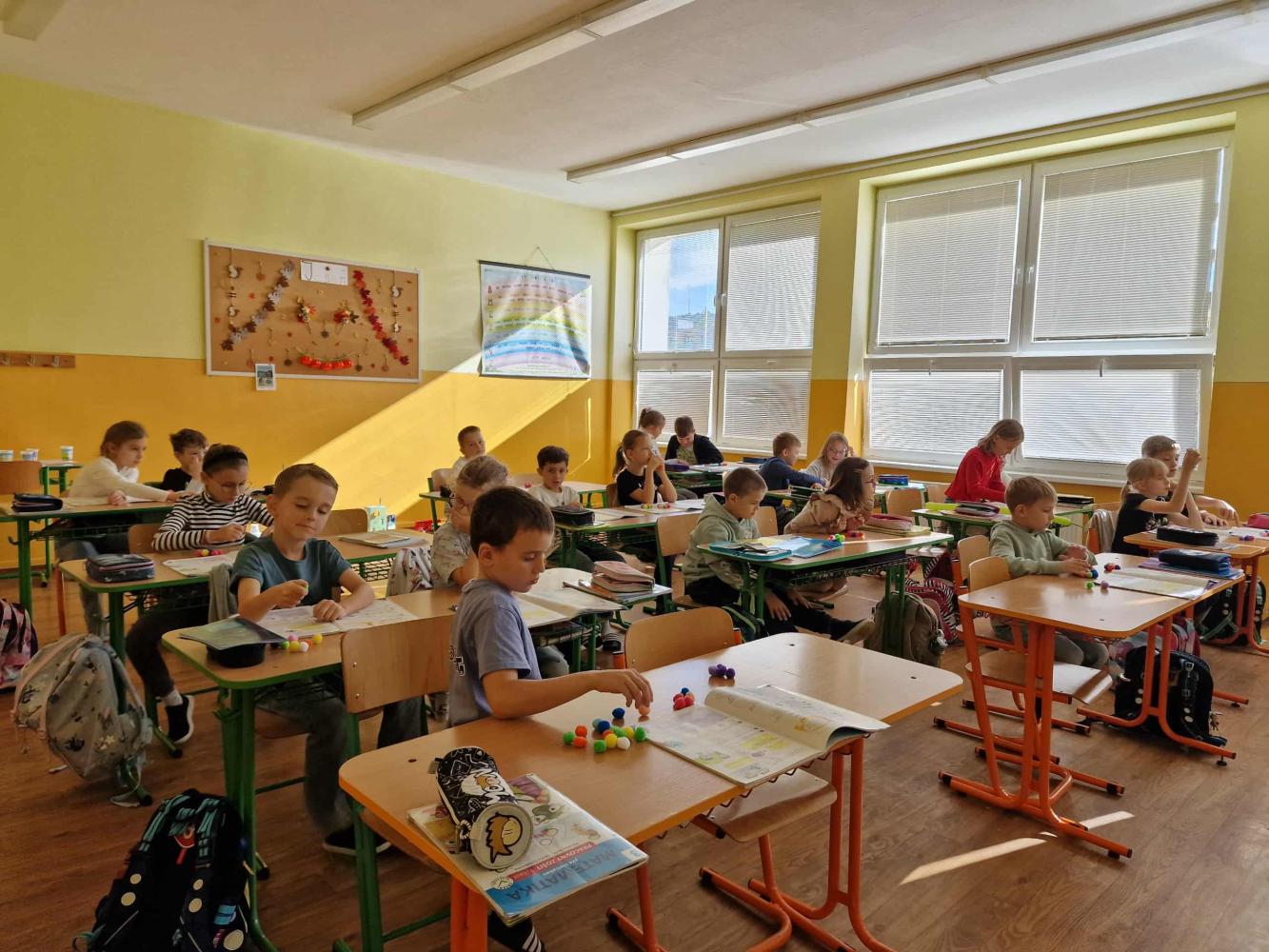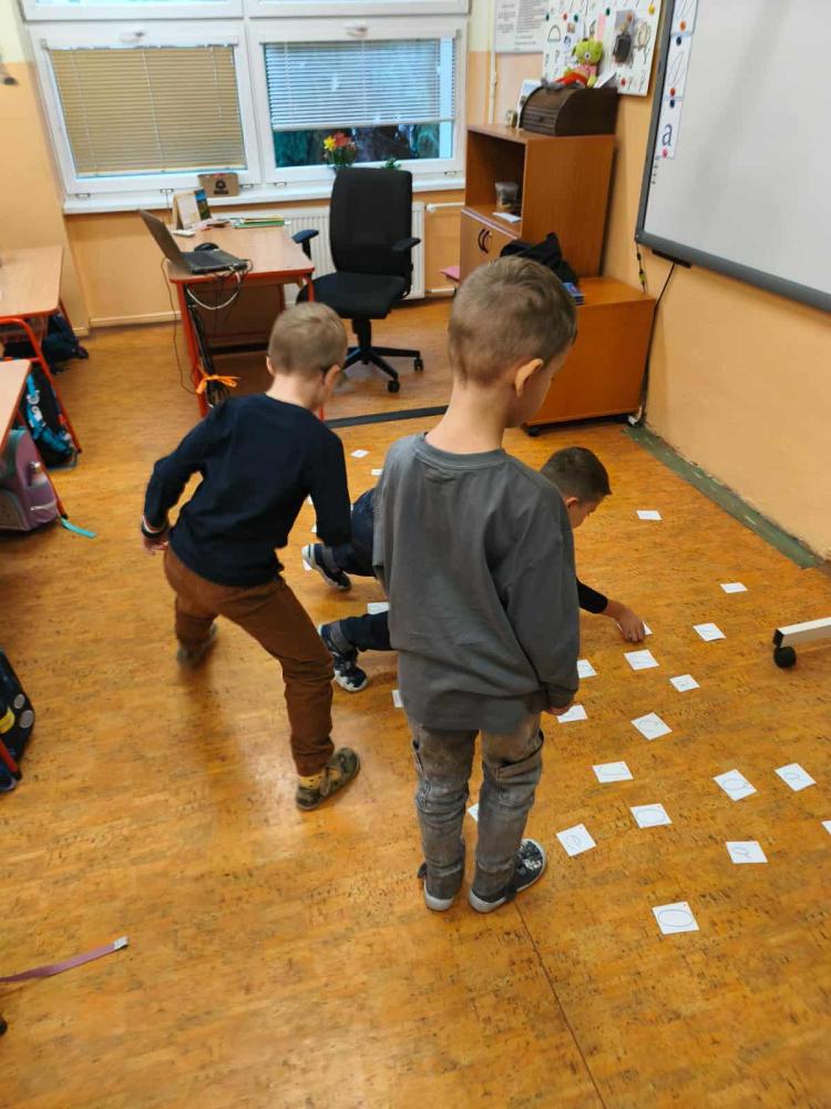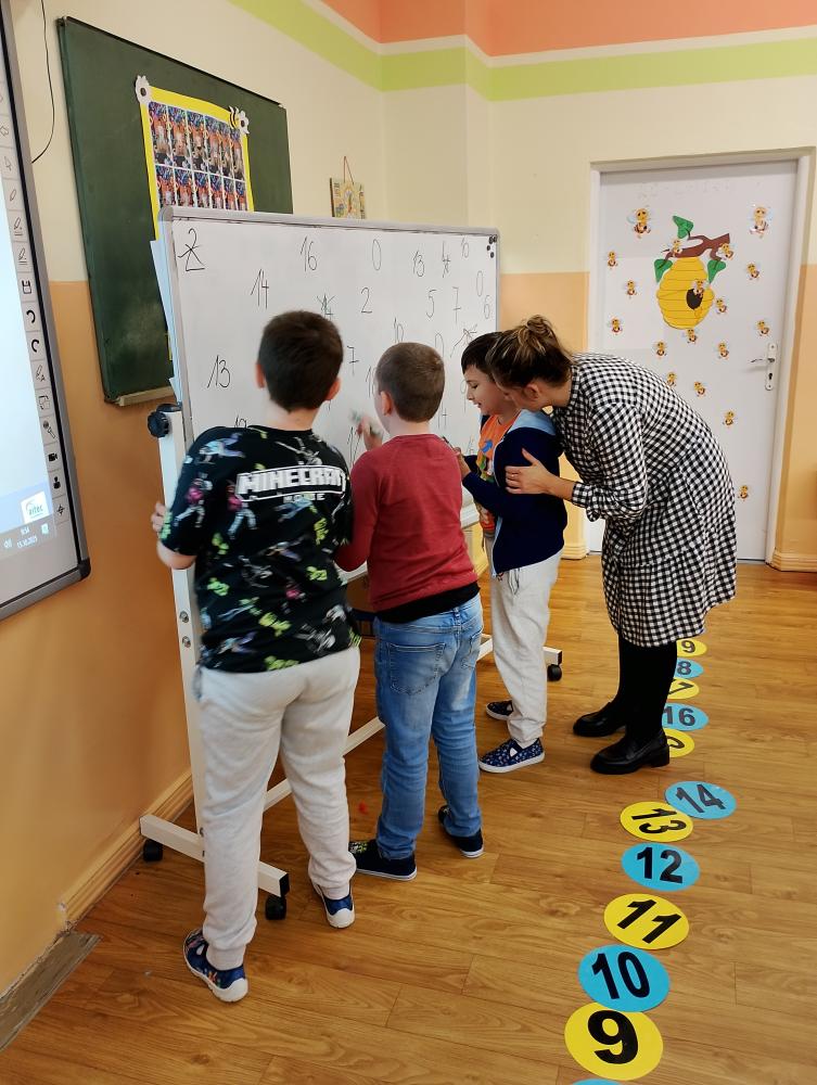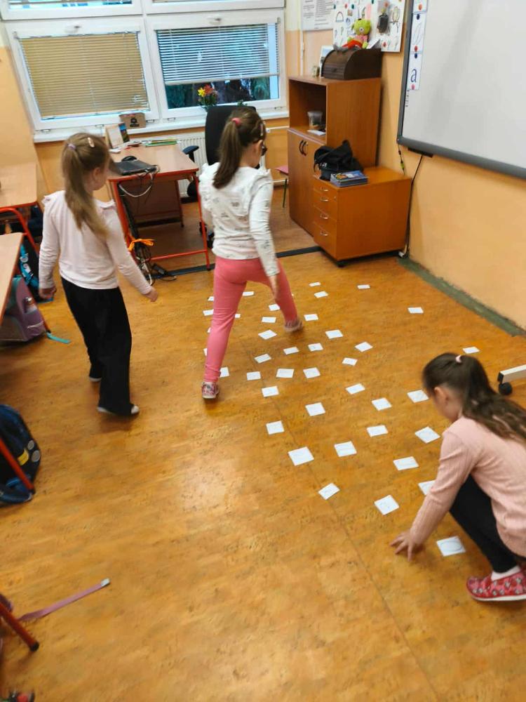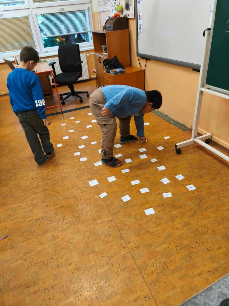 V druhej časti hodiny žiaci hľadali výsledky aj na číselnom rade umiestnenom na zemi. Hravou formou si tak precvičili sčítanie a odčítanie do 20 s prechodom cez 10. Žiaci pracovali s nadšením, spolupracovali v tímoch a učenie prebiehalo aktívne a zábavne.