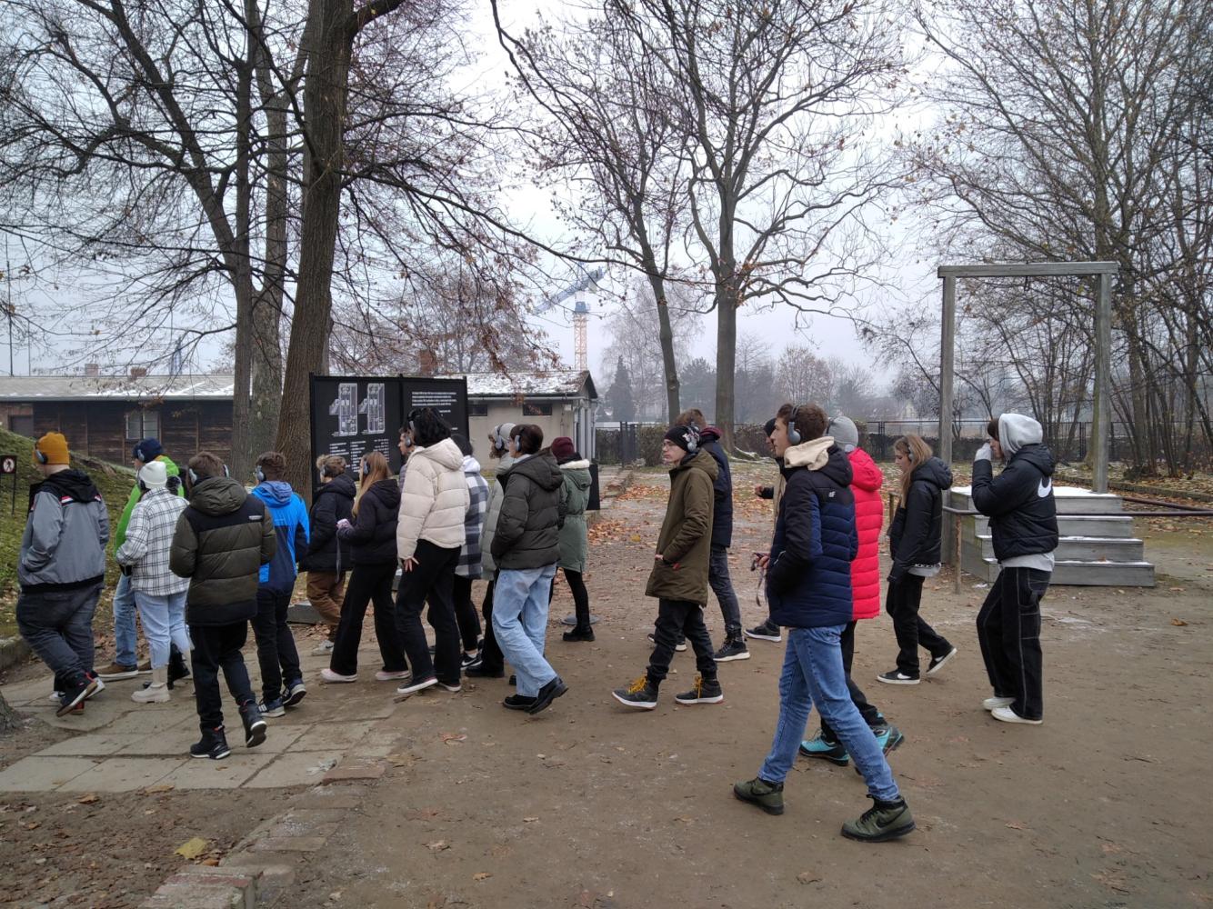 podmienky, nedostatok vody a veľa potkanov. Ukázali nám drevenú budovu, kde bolo mnoho drevených postelí a v ďalšej takzvané "záchody". Na svoju potrebu mali 2 minúty, a to všetci v ten istý čas. Slabí a veľmi chudí sa neudržali a v ľudských výkaloch sa utopili. Sprievodkyňa ukončila prehliadku blízko strážnej veže, odkiaľ bol krásny výhľad na celý tábor, ktorú sme si pre rekonštrukciu nemohli pozrieť. Na záver našej exkurzie sa nám poďakovala za pozornosť, tiché a dôstojné správanie sa žiakov a zaželala nám veľa úspechov