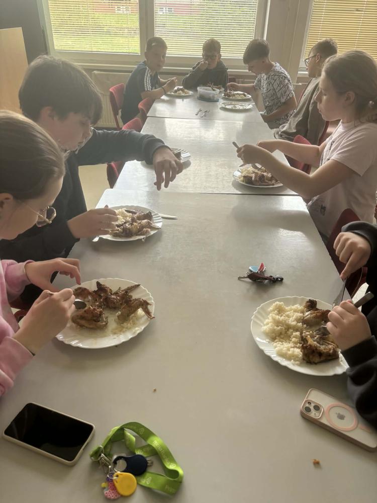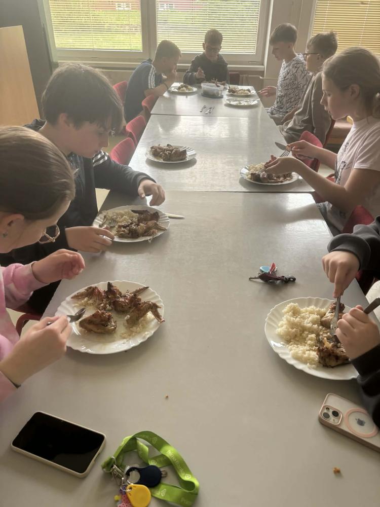 Dnes sa žiaci tried 6.A a 6.B počas hodiny techniky pustili do netradičnej, no o to chutnejšej aktivity – prípravy obeda. Ich kulinárske úsilie prinieslo skvelý výsledok v podobe pečených kuracích krídeliek na medveďom cesnaku s ryžou.